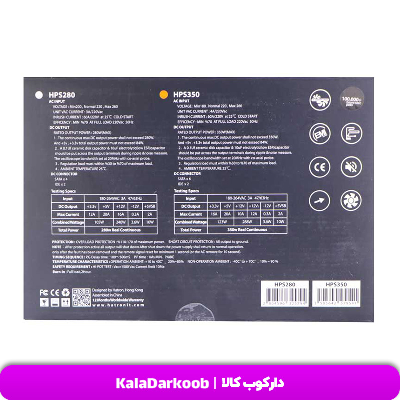 پاور HPS350 یکی از محصولات خوش ساخت و با کیفیت شرکت هترون می باشد که با قیمتی اقتصادی روانه ی بازار شده است. این منبع تغذیه ی غیر ماژولار مناسب استفاده در سیستم های کامپیوتری معمولی بوده و کانکتور های آن به صورت رابط های متصل به کابل در قسمت پشتی آن تعبیه شده است. Hatron HPS350 همچنین دارای استانداردهای حفاظتی امنیتی مربوط به مقاومت در برابر نوسانات برق، ولتاژ بیش از حد، اتصال کوتاه، افزایش حرارت و … بوده تا ضمن تامین انرژی، از قطعات متصل شده به سیستم به درستی محافظت شده و بر طول عمر آنها افزوده شود. محدوده ولتاژ ورودی این منبع تغذیه نیز برابر با ۱۸۰ تا ۲۶۰ ولت و شدت جریان ورودی آن ۳ آمپر عنوان گشته است. توان اسمی پاور Hatron مدل HPS350 معادل ۲۸۰ وات می باشد اما با توجه به اینکه در اکثر پاورها توان واقعی کمتر از میزان اعلام شده خواهد بود و تغییر آن متناسب با فشار کاری امکان پذیر است، این مدل پاور هترون بر اساس بازده ۸۲ درصدی خود، توان واقعی حدود ۲۶۰ وات را ارائه می نماید. منبع تغذیه کامپیوتر Hatron HPS350 از سیستم خنک کننده قوی بهره می برد و به یک فن ۱۲۰ میلی متری با قابلیت تنظیم خودکار دور موتور نسبت به جریان خروجی نیز مجهز است. فن به کار رفته در این پاور از کمترین میزان صدا در مقایسه با دیگر پاور های هم رده خود برخوردار بوده و به خوبی تجهیزات داخلی دستگاه را خنک می نماید. پاور ارزان قیمت HPS350 هترون دارای استاندارد های طراحی و تولید CE و FCC بوده و به خوبی از عهده ی تامین انرژی قطعات کامپیوتر های اداری و خانگی غیر حرفه ای بر می آید.